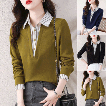 【韓優衣庫】時尚假兩件長袖減齡棉襯衫女2025春秋季新款洋氣大碼上衣T恤外穿打底衫